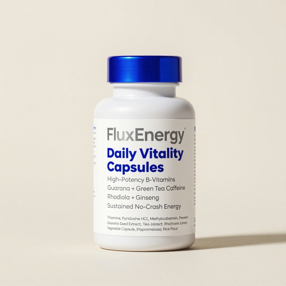 FluxEnergy Daily Vitality Capsules deliver a gentle, all-day energy lift with essential B-vitamins, natural caffeine sources, and adaptogens to combat fatigue and support focus without jitters. Perfect entry-level boost for busy days, workouts, or mental clarity on a budget.